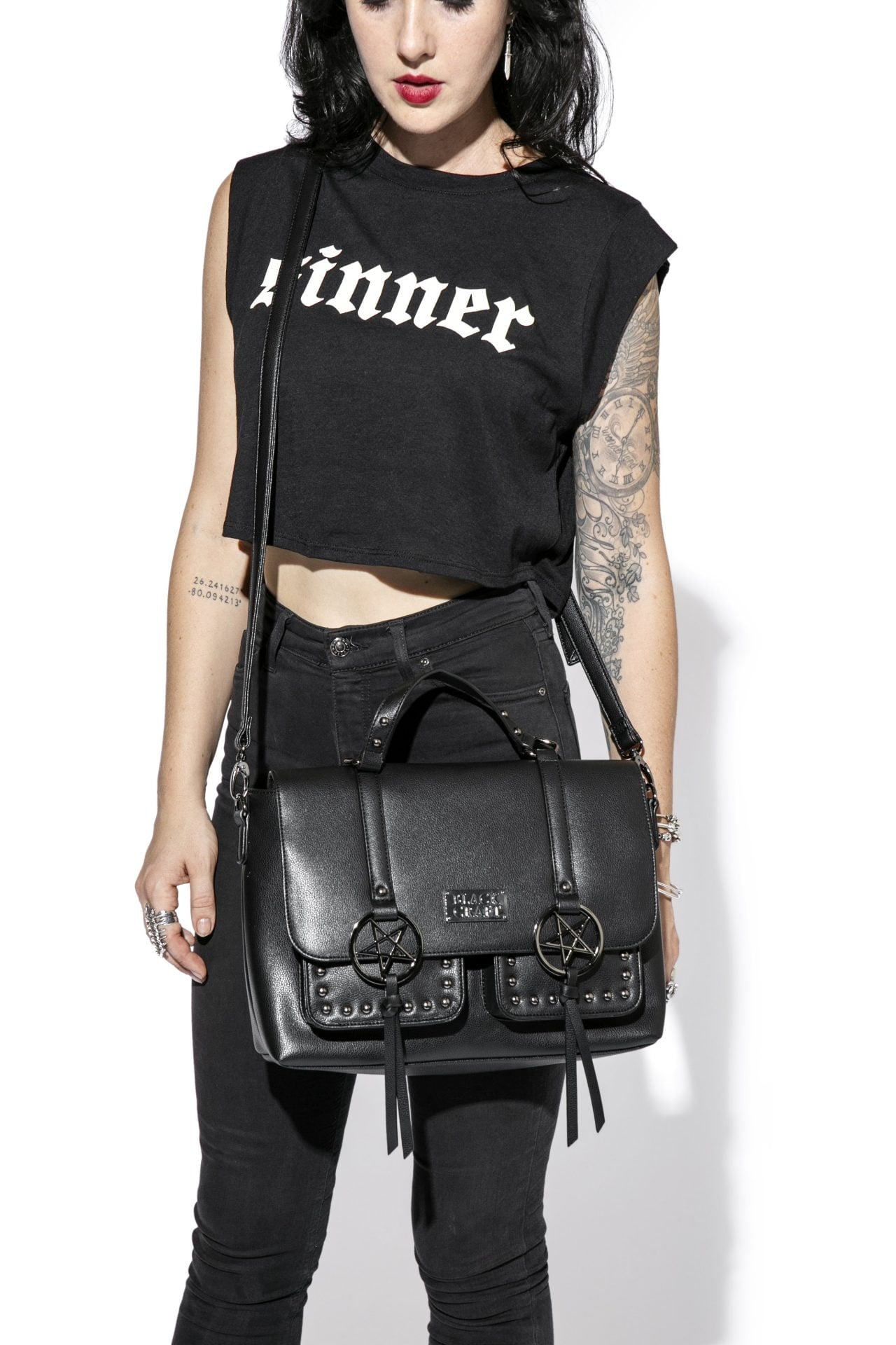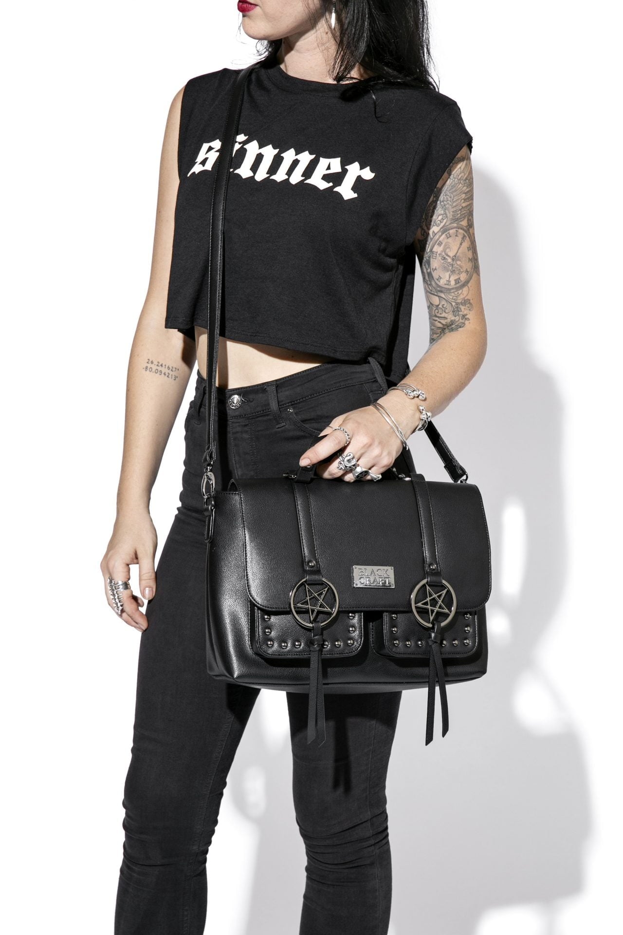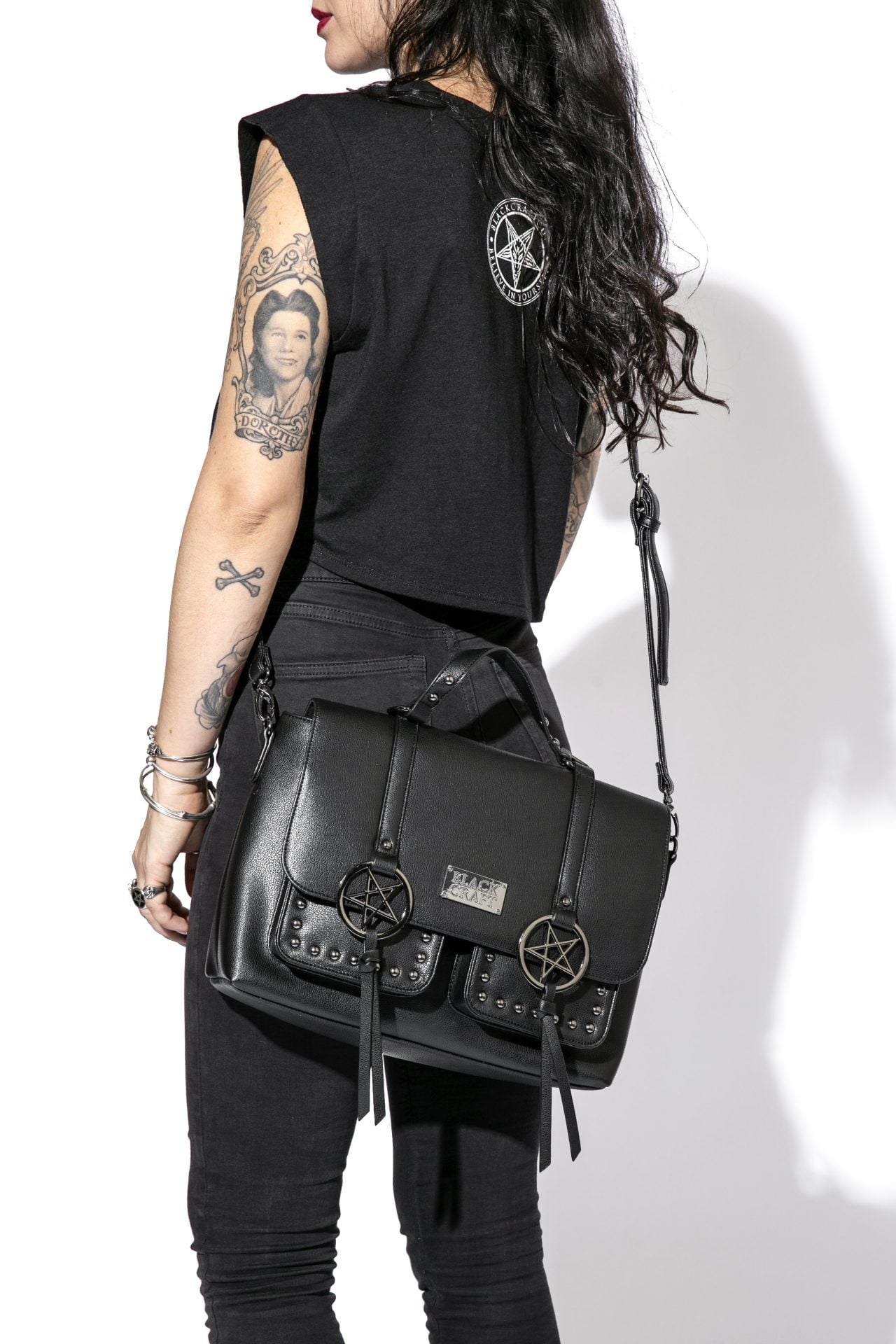 Faux leather messanger bag with gunmetal finish pentagrams and Blackcraft logo plaque. 46" adjustable removable crossbody strap included. Interior features 1 zip pocket, 1 slit pocket and custom interior lining.