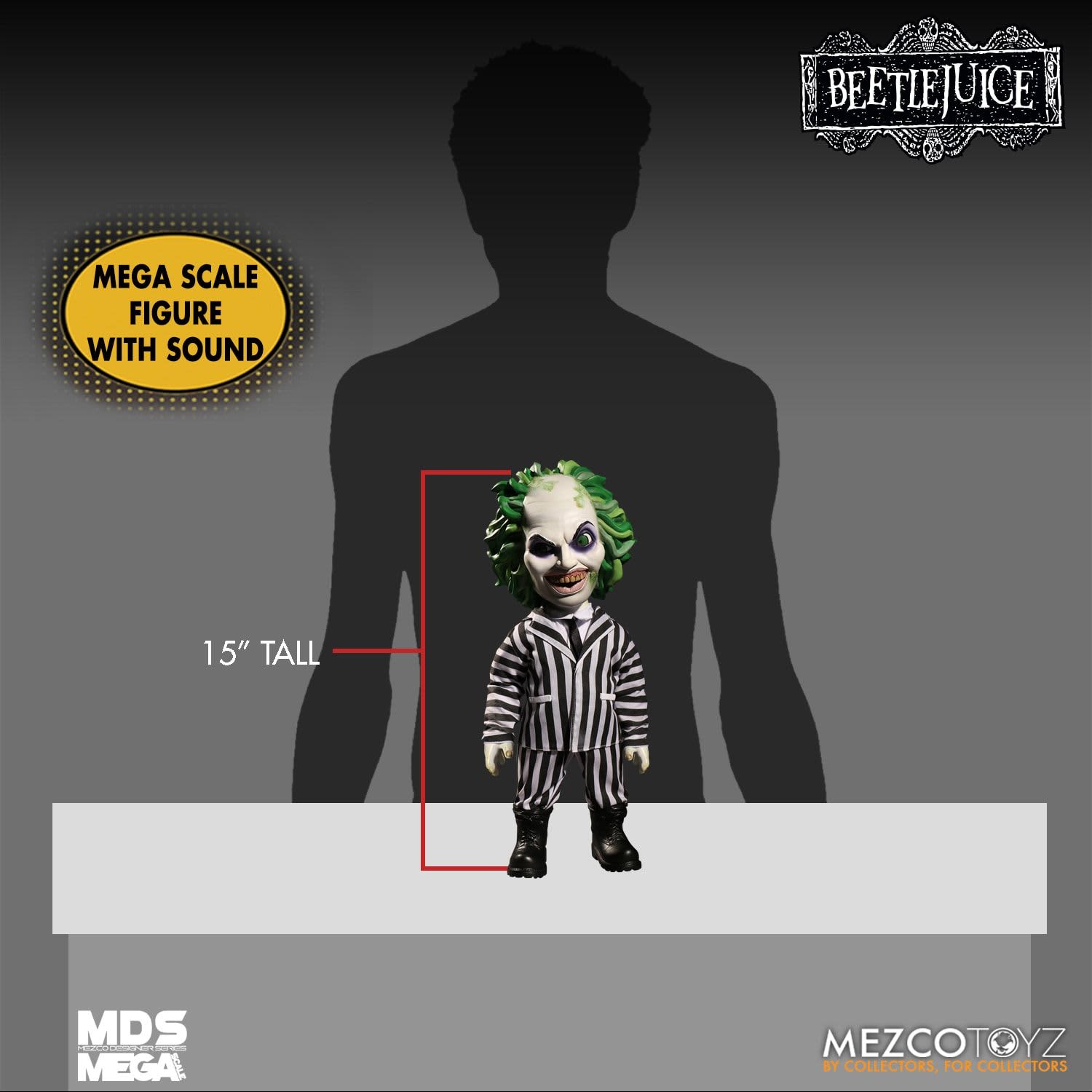 The MDS Mega Scale Talking Beetlejuice stands approximately 15" tall and features 11 points of articulation. He is packaged in a collector friendly window box, perfect for display.