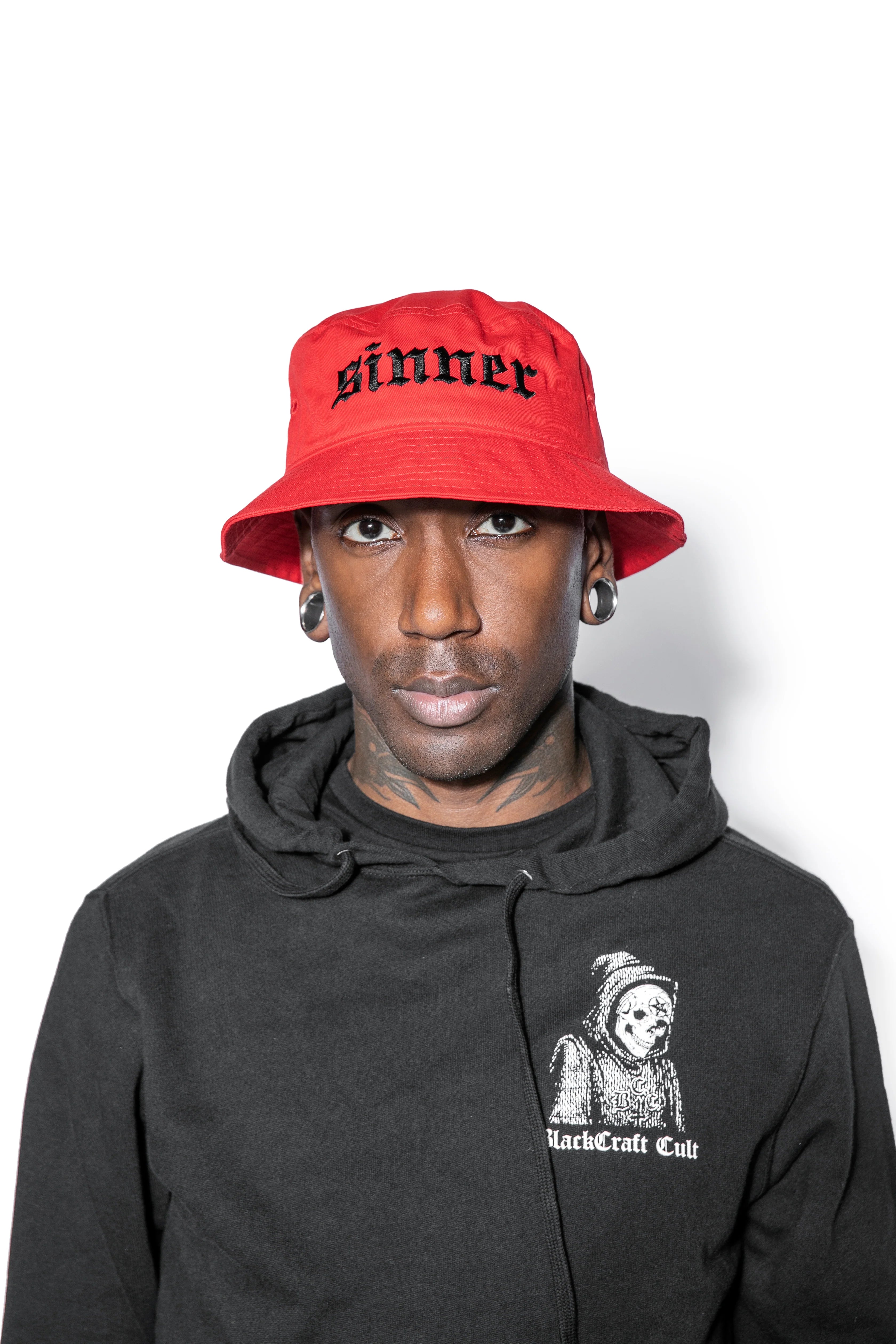 - Bucket hat with sinner embroidered on the front.