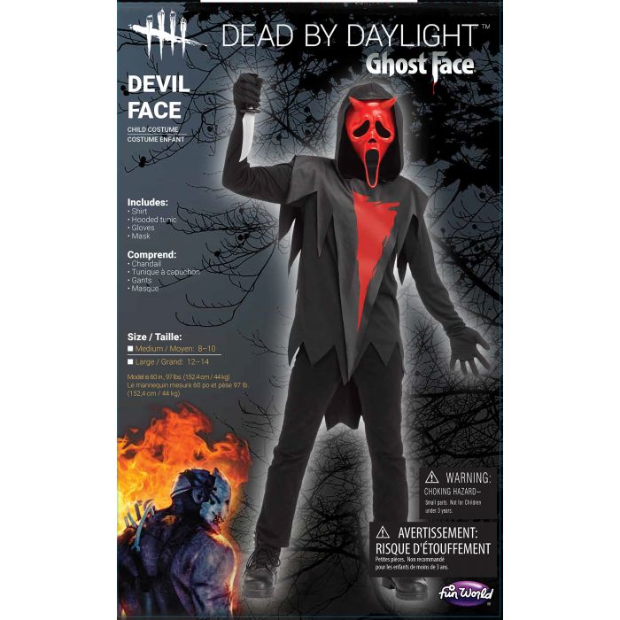 You can bring Ghost Face to life with this Devil Face Dead by Daylight Child Costume. This devil costume includes a black robe and tunic with red graphic and, of course, the iconic red Ghost Face mask with devil horns.