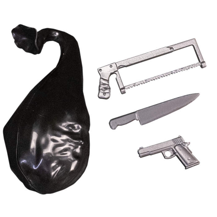Blood Bath Art the clown features color change blood splatter action! Simply spray with ice water or place the figure in your freezer to see Art get drenched in the blood of his victims. Blood Bath Art the Clown comes complete with his trashbag of terror to hold his 3 weapons of choice; a pistol, a knife, and his trusty hacksaw!
