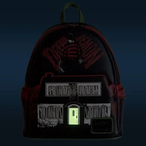 Entertainment Earth Exclusive! - Sleep with one eye open and prepare for all the scares that Freddy has in store this scary season with this A Nightmare on Elm Street Freddy Mini-Backpack - Entertainment Earth Exclusive! It is made of faux leather and features top zipper closure and front pocket, side pockets, matching themed lining, adjustable straps, applique, and printed details. Dim the lights and watch the door of the iconic home glow-in-the-dark! This mini-backpack approximately measures 10 1/2-inches tall x 9-inches wide x 4 1/2-inches long. Don't be afraid - Order this order this limited edition exclusive today, while supplies last! Ages 17 years and up.