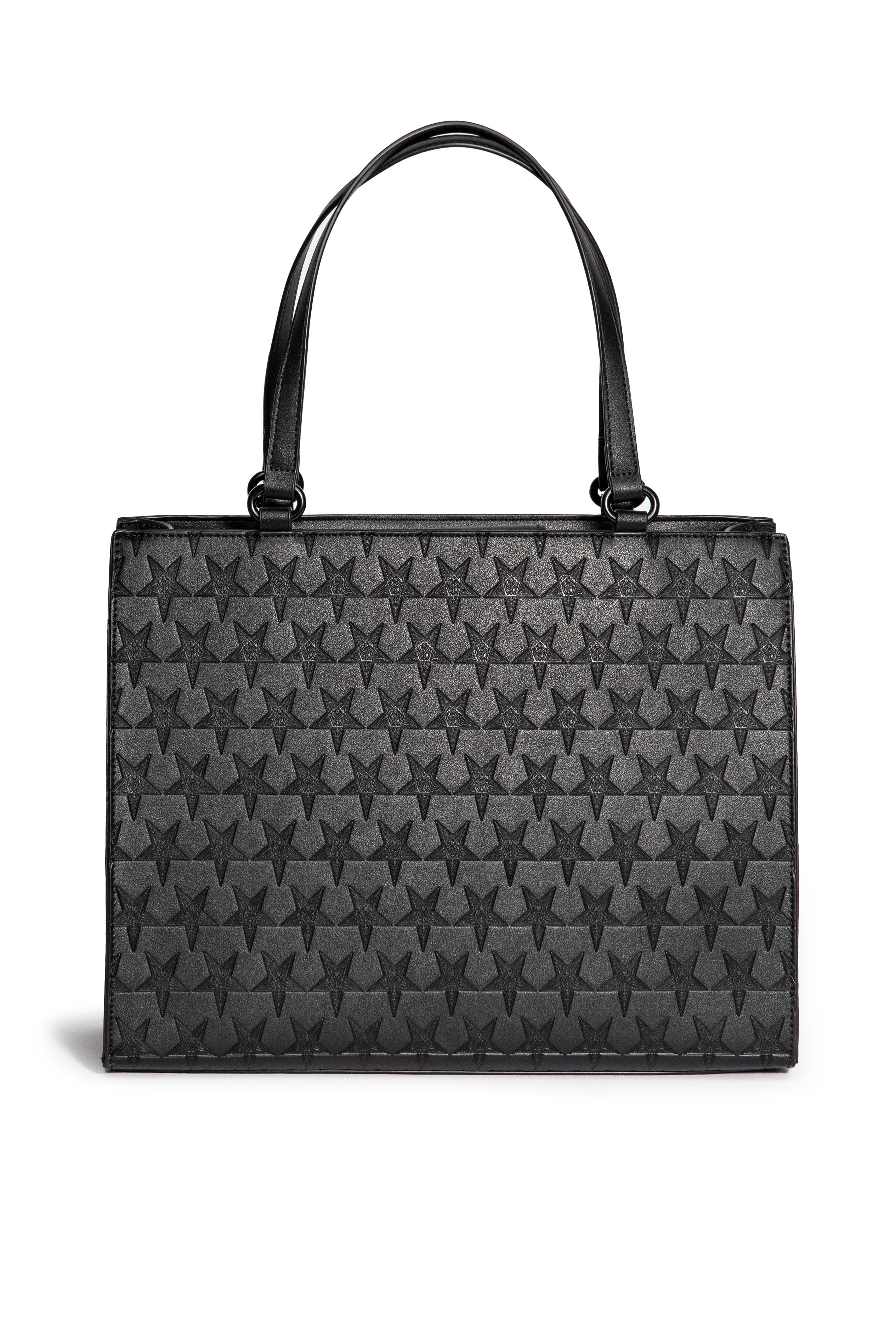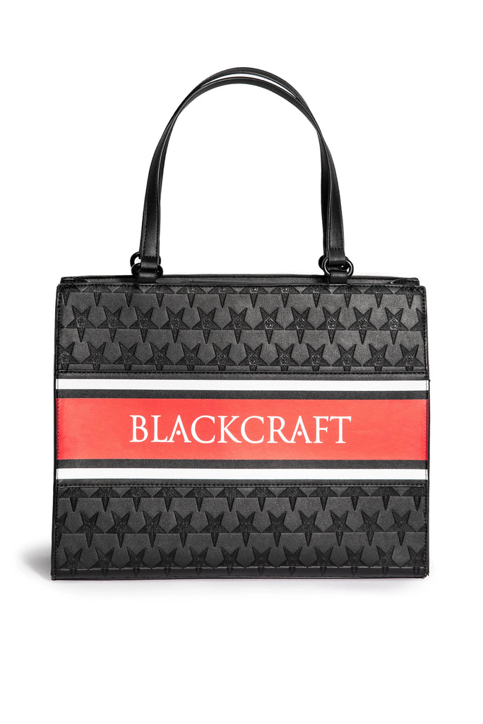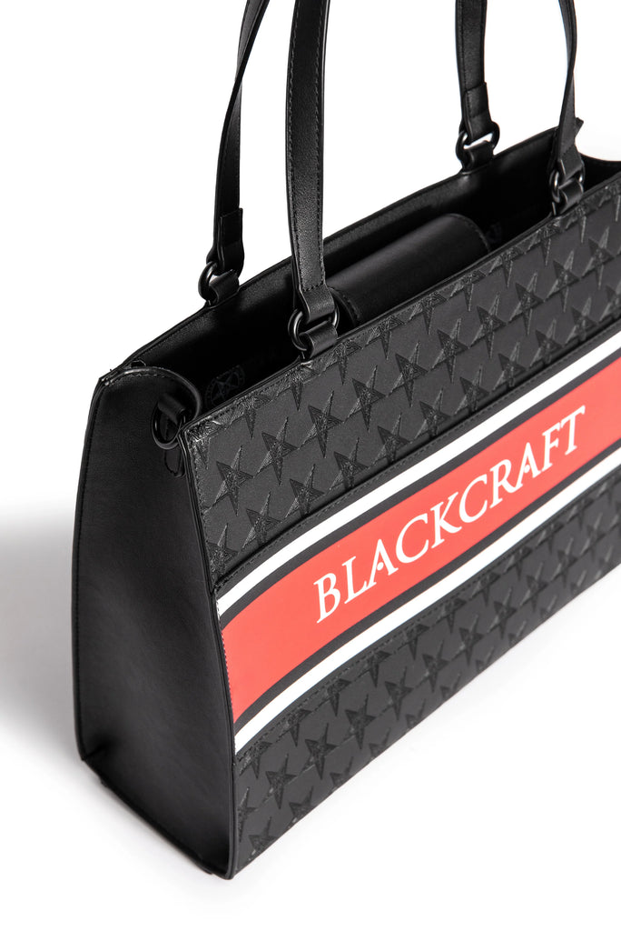 Baphomet embossed PU leather with logo tape across the front. Features top handle and removable crossbody strap.