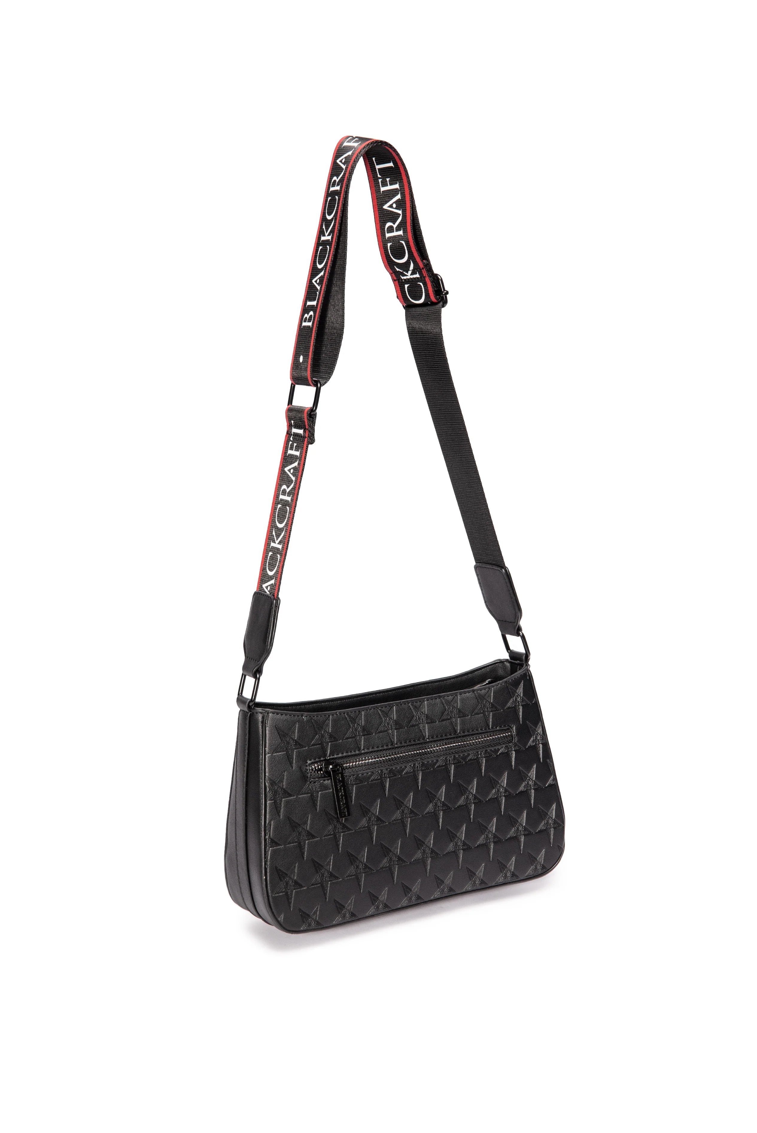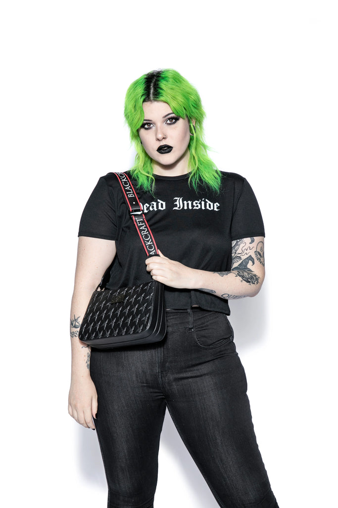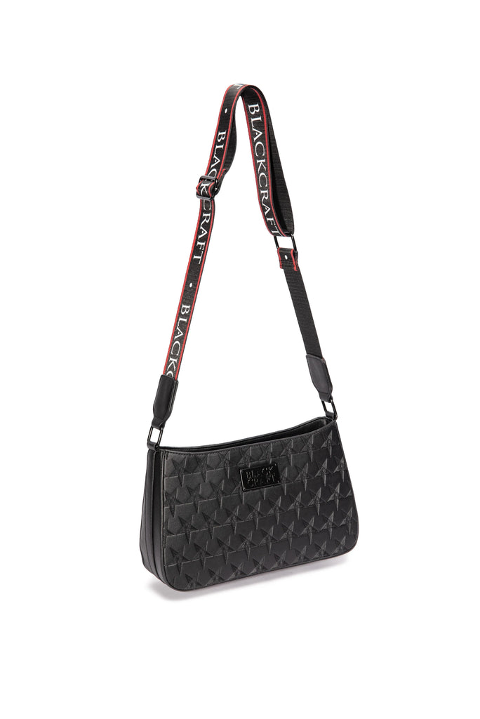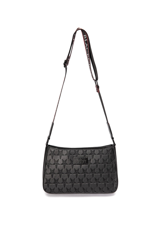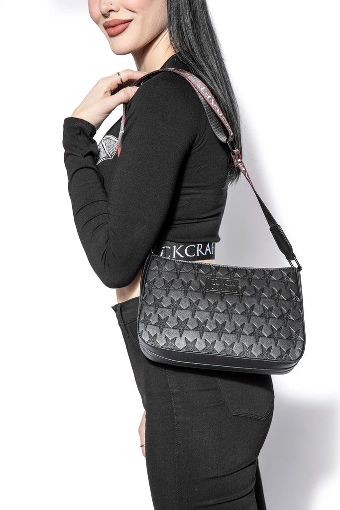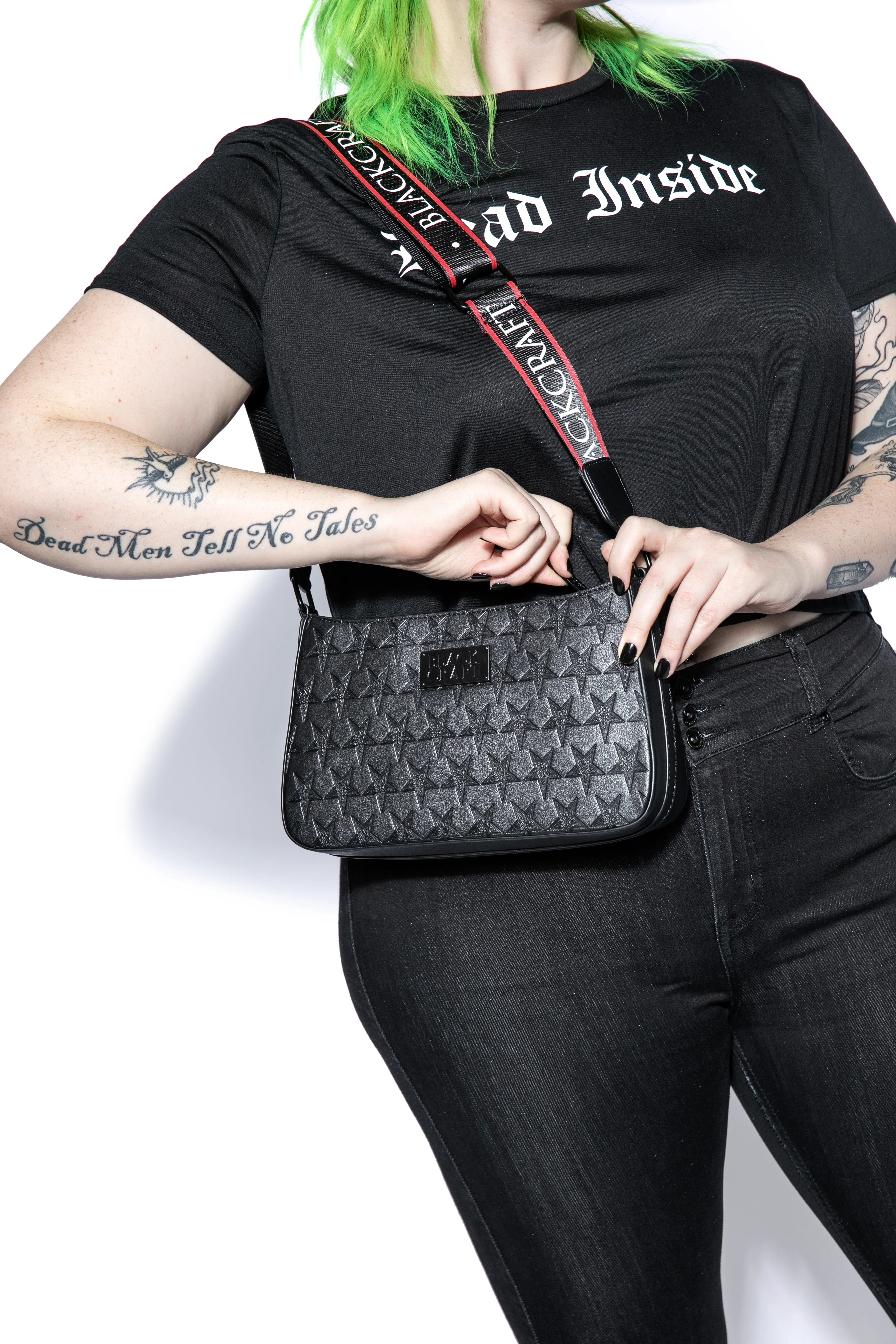 Top handle Baphomet embossed bag with adjustable logo strap. Can be used as crossbody. Features top zipper and back zipper pocket.