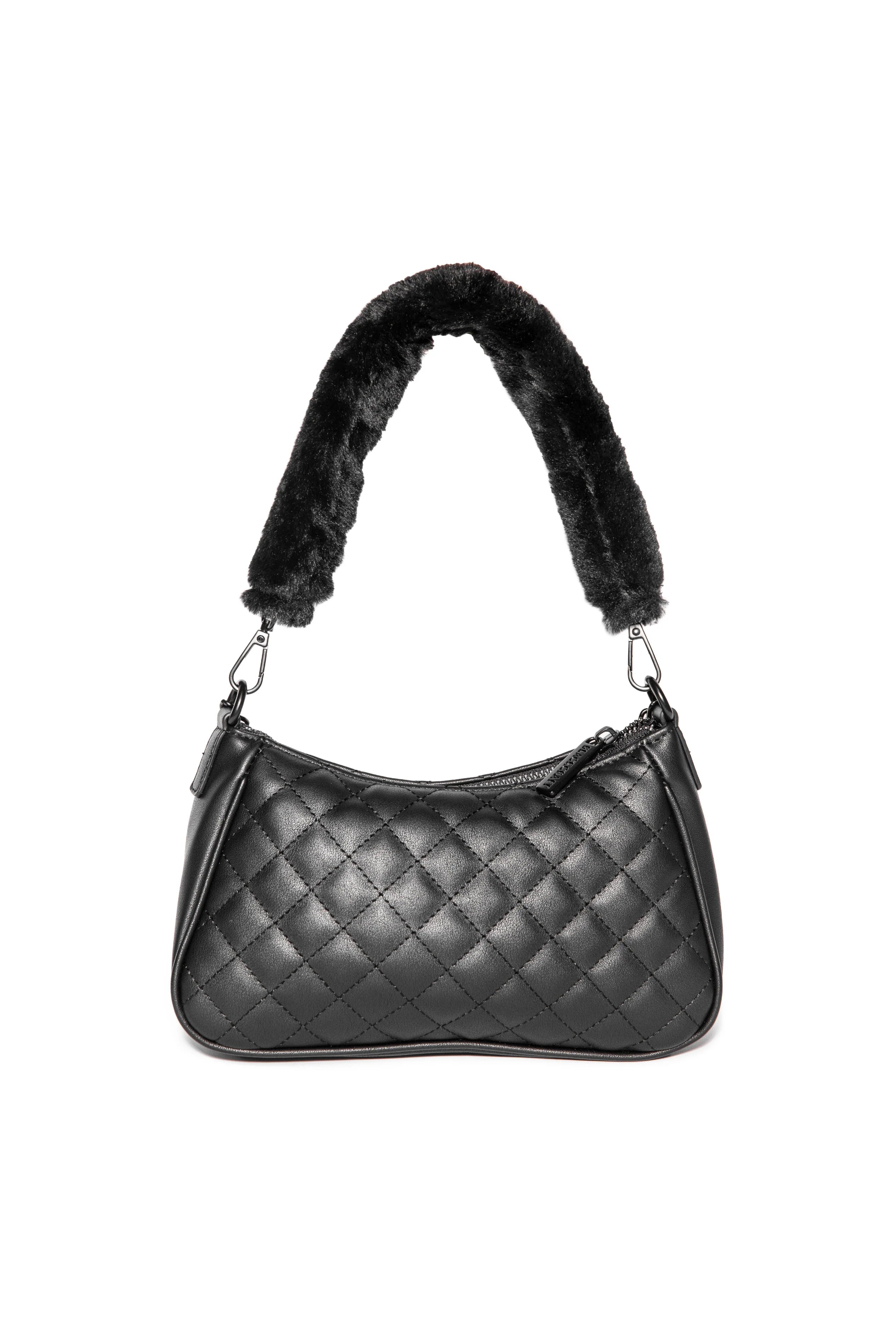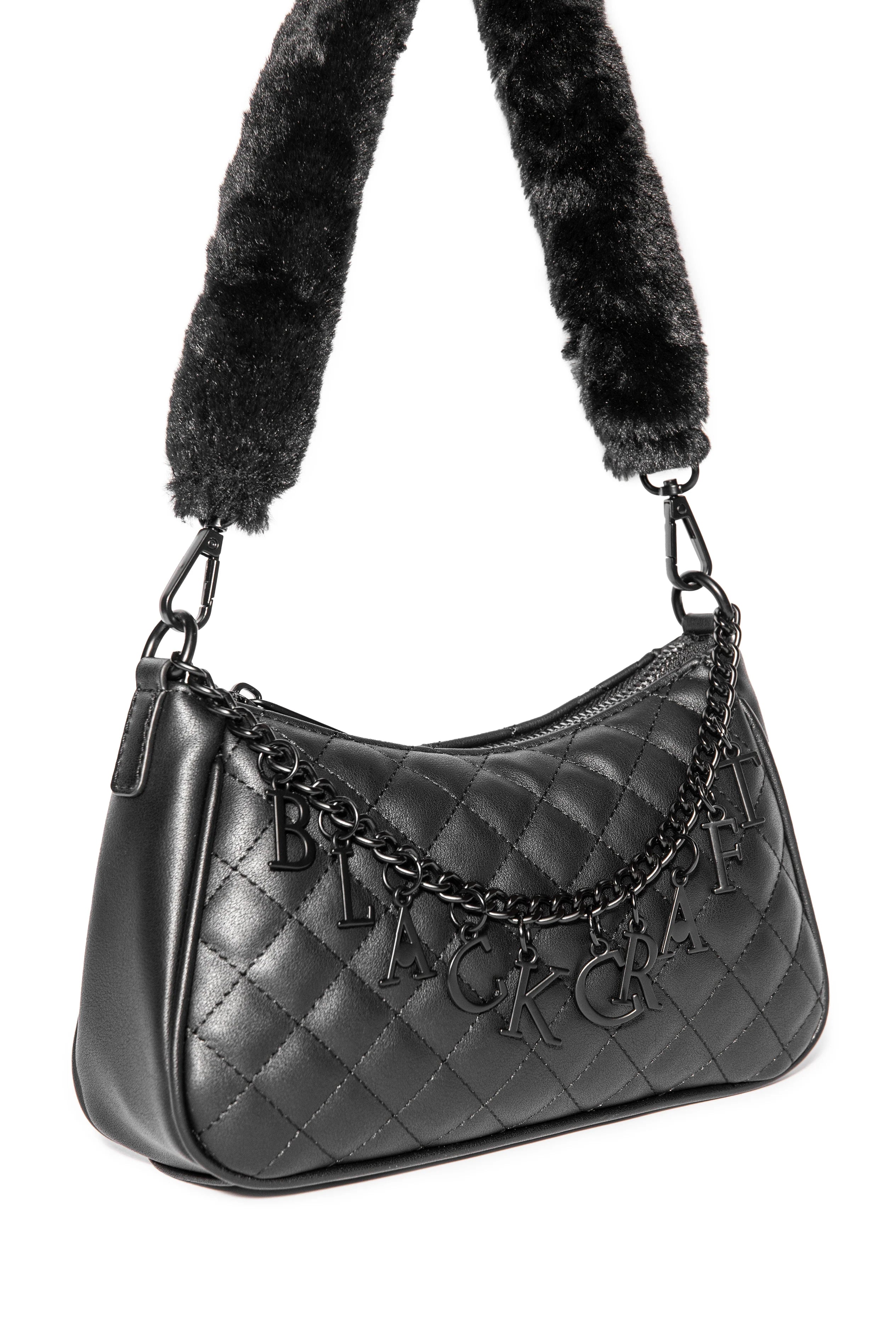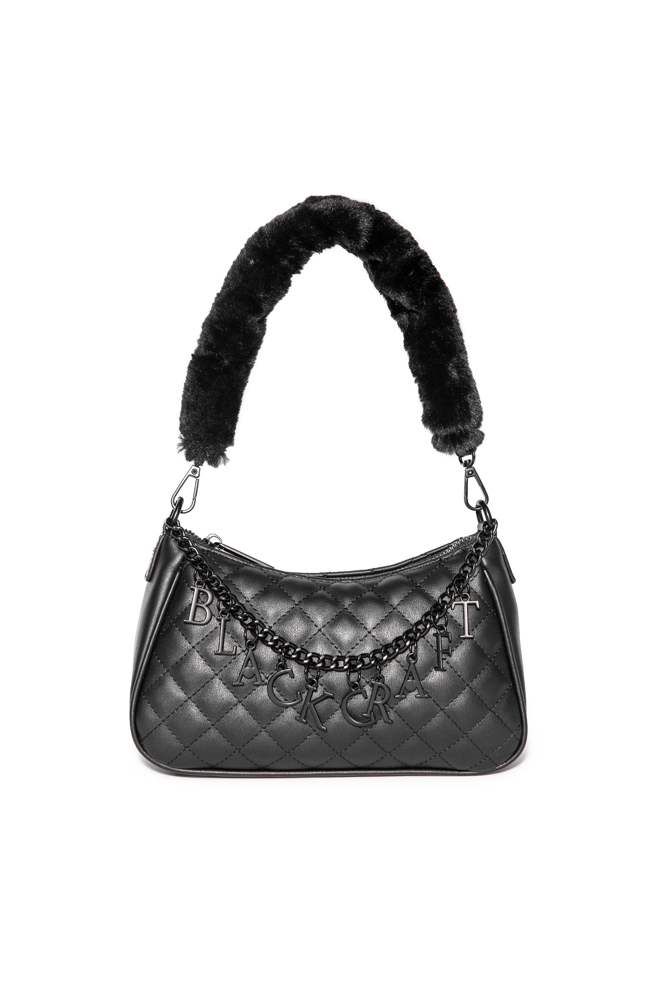 Quilted faux leather shoulder baguette with Blackcraft letter charms on a chain. Features a removable faux fur shoulder strap and pentagram zipper pull.