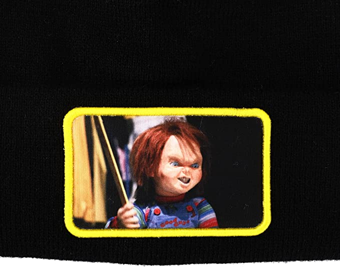 • CUSTOM DESIGN: Chucky carries a knife in a yellow frame on front patch artwork on this cuff beanie. Fans of the Chucky movies will love to celebrate the character with the custom design on this cuff beanie.