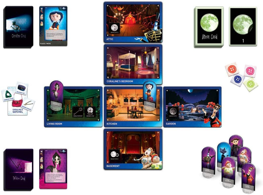 Players assume the roles of the Ghost Children who were captured by the Beldam (the Other Mother). Now they are trying to free Coraline and her parents from the Beldam's evil clutches. They will confront Mr. Bobinsky and his jumping mouse circus, fend off the Other Father on his mantis tractor, wrestle the pearl ring from Miss Spink and Miss Forcible, and steal the Skeleton Key and Snow Globe to ultimately set Coraline free. The players all win or lose the game together as a team! But be careful! The Beldam will thwart your plans at every turn. And be quick! When the button shadow eclipses the moon, the Beldam has won the game and Coraline is trapped in the Other World forever!