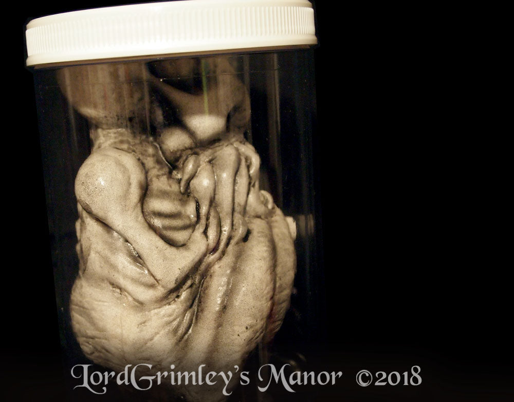 This is a high quality hand-painted latex prop and has many possibilities. Stuff him and mount him on your mantel. Just leave him locked away in his jar for all of eternity. Or better yet, flood his jar with a liquid of your choice for better preservation. (see note)