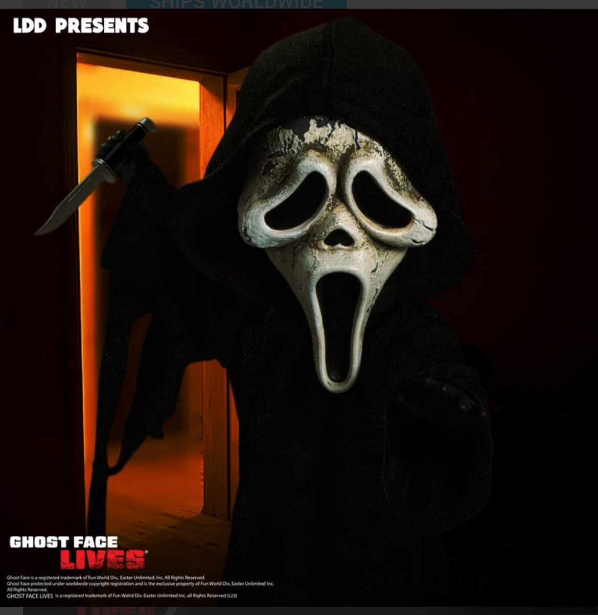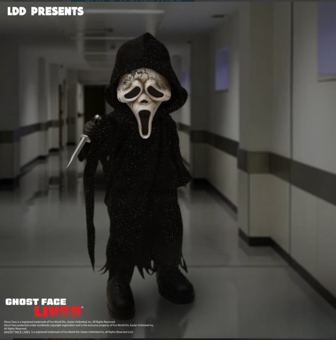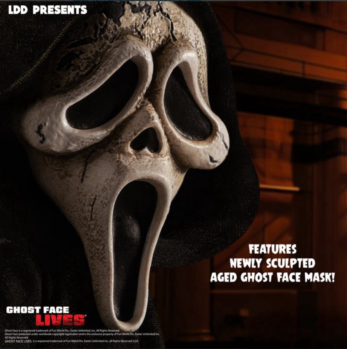 The LDD Presents Ghost Face - Zombie Edition stands 10" tall and features 5 points of articulation. He is packaged in a die-cut window box, perfect for display.