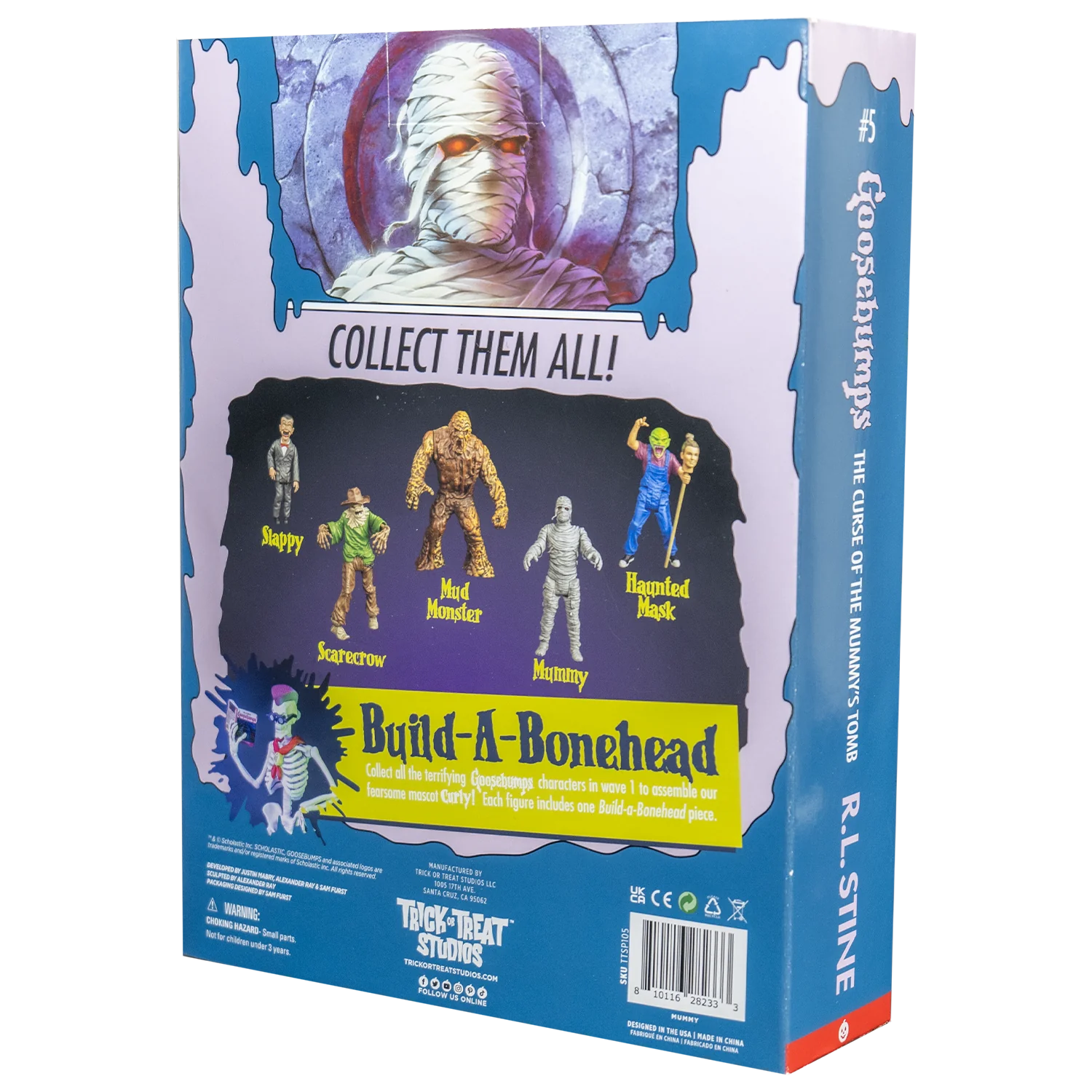 Hold the fight and fun of the Scholastic book series in your hands! With the officially licensed Goosebumps 5” Action Figure Collection! From the chilling Goosebumps installment - The Curse of the Mummy's Tomb! This figure features 5 points of articulation and comes with a collectible trading card and stand.
