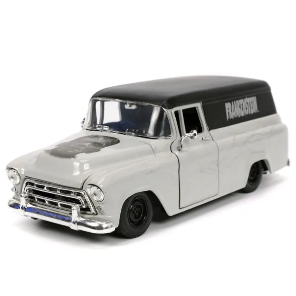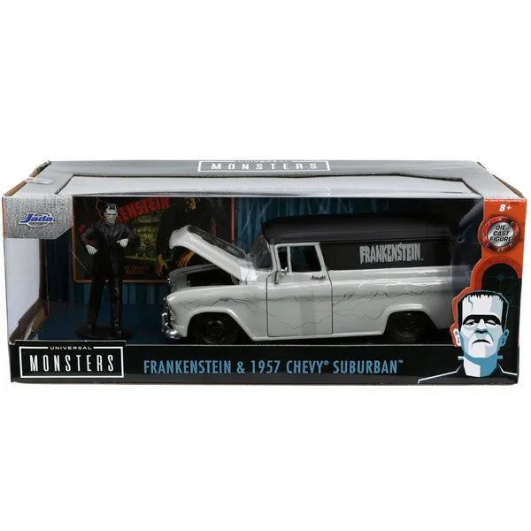 Cruise along with your favorite abominable creation, Frankenstein! This 1957 Chevy Suburban takes styling cues directly from the iconic Universal Monster. This frightening 1:24 scale vehicle features a die-cast metal body and a bold graphic on the hood! A die-cast metal Frankenstein figure is also included. Ages 8 and up.