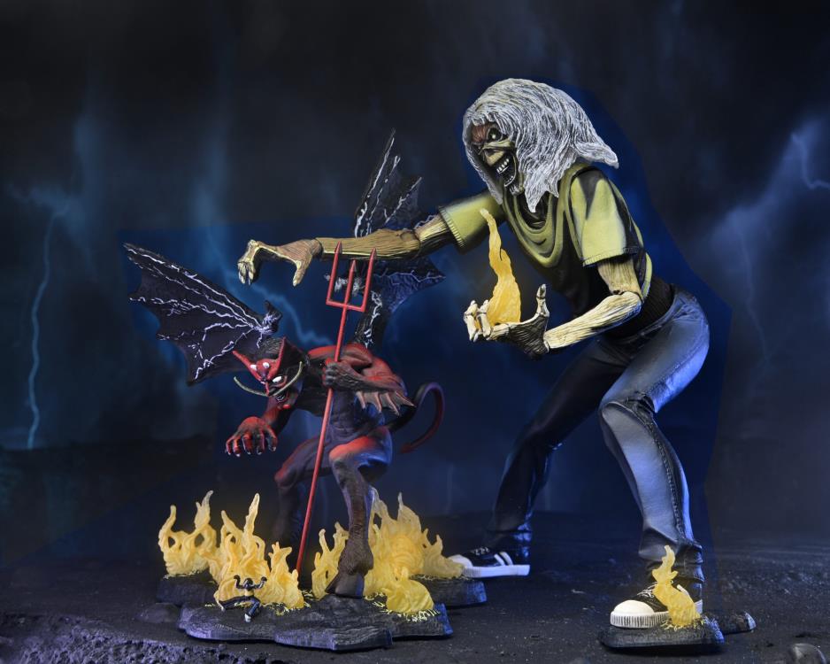 Eddie features stunning detail in paint and sculpt that really recreates the illustrations, and is puppeteering the devil himself, who has his own even smaller Eddie puppet. The set also includes a Satan's head accessory to recreate the cover art for "The Number of the Beast" single cover. Comes in special 40th anniversary 5-panel packaging with opening front flap.