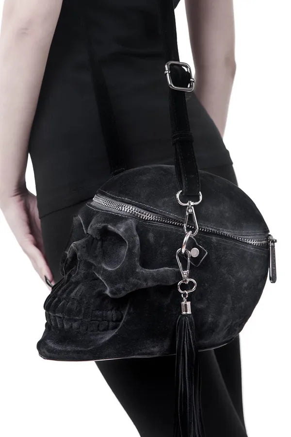 Welcome our newest skull member, in lush velvet coating! The 'Grave Digger' handbag is yer creepy must-have - large human skull handbag - with intricate detailing, zip opening, long shoulder strap and detachable tassel detail. All Hail the Halloween Queen!