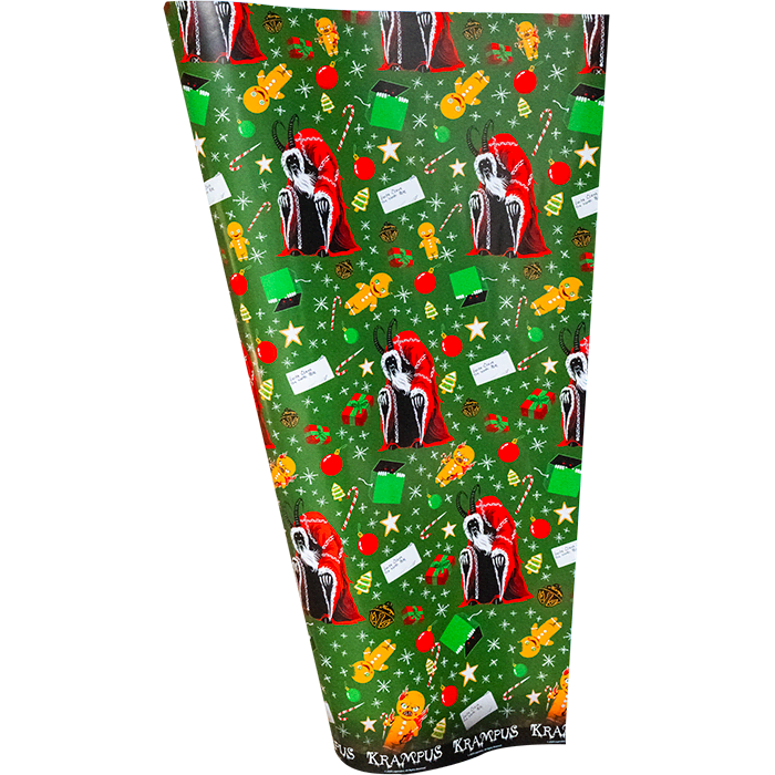 This premium weight wrapping paper roll is 30" x 96" with original artwork based on Krampus.
