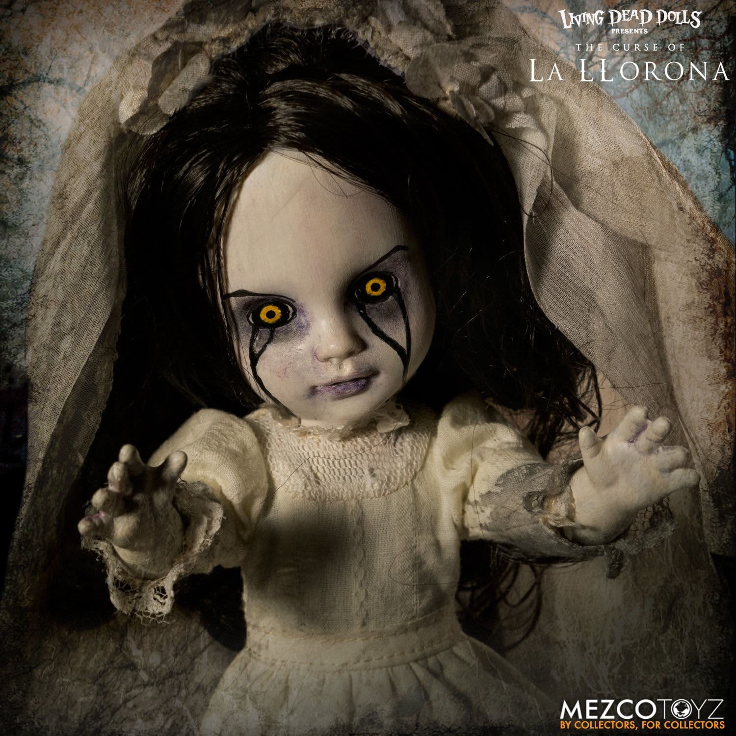 La Llorona joins the Living Dead Dolls family and wears her infamous white gown with black, curly hair peaking out from her veil. She cries black tears as she searches desperately for her children,