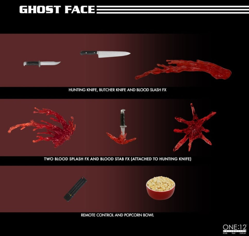 Ghost Face wears his signature black hooded robe, with posable hood and sleeves through integrated posing wire. He swings knives or a reaper’s scythe, complete with multiple blood FX that attach to weapons. The mysterious killer also carries a popcorn bowl and a remote control for perfect horror movie nights.
