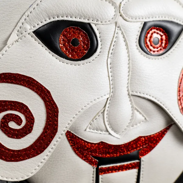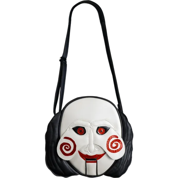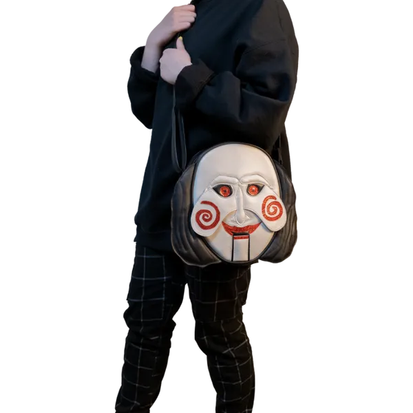 Based on the Billy Puppet Jigsaw used to terrify his vicitms, this is the perfect way to show your love of Saw.  This incredible purse is made using the highest quality Vegan Leather for excellent durability. In addition, the purse has a soft inner lining with a large center pocket, as well as an inner side pocket. The outside features a layered design to accentuate details with red glitter accents and an adjustable strap for shoulder or cross body comfort.