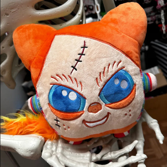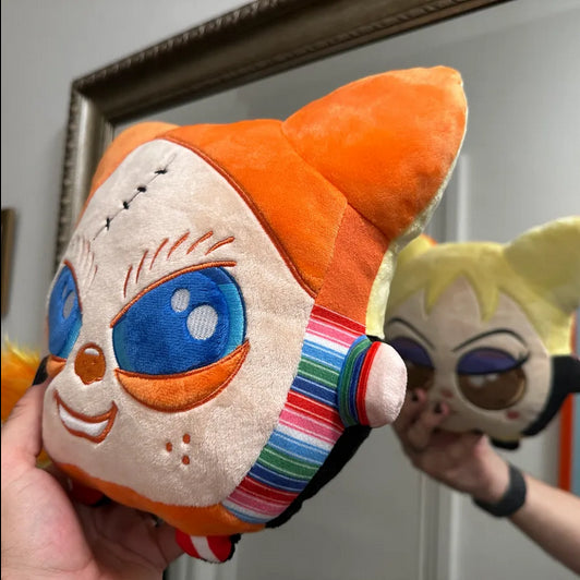 This horror squishy The Good Them (Good Guys) pillow plush by Squaredy Cats is approximately 10"x10"! A Two-sided pillow plush featuring your favorite killer doll (Chucky) on one side and his doll of a bride (Tiff) on the other!
