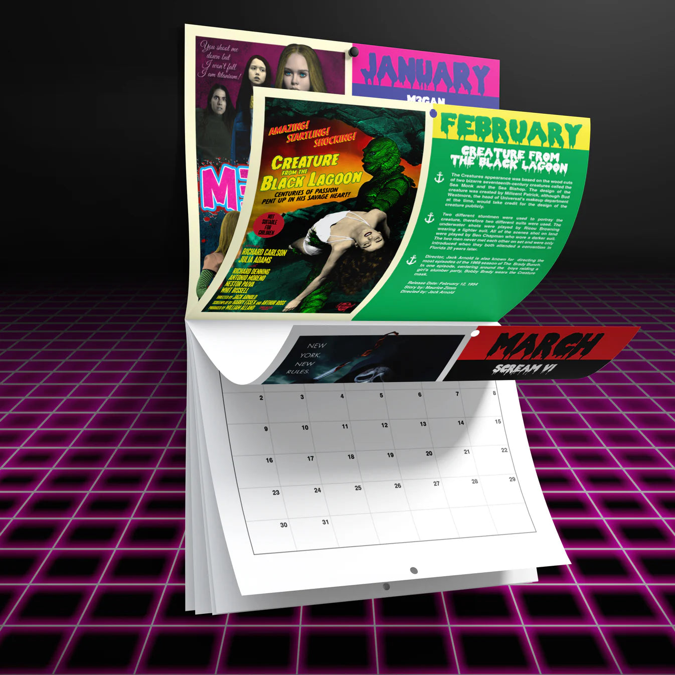 The "This Month In Horror" Calendar is back for 2025! More posters! More facts per movie! More fun! Each month has it's own highlighted movie and poster design of a movie that was released in that month! This is original artwork designed by Chris Butler.